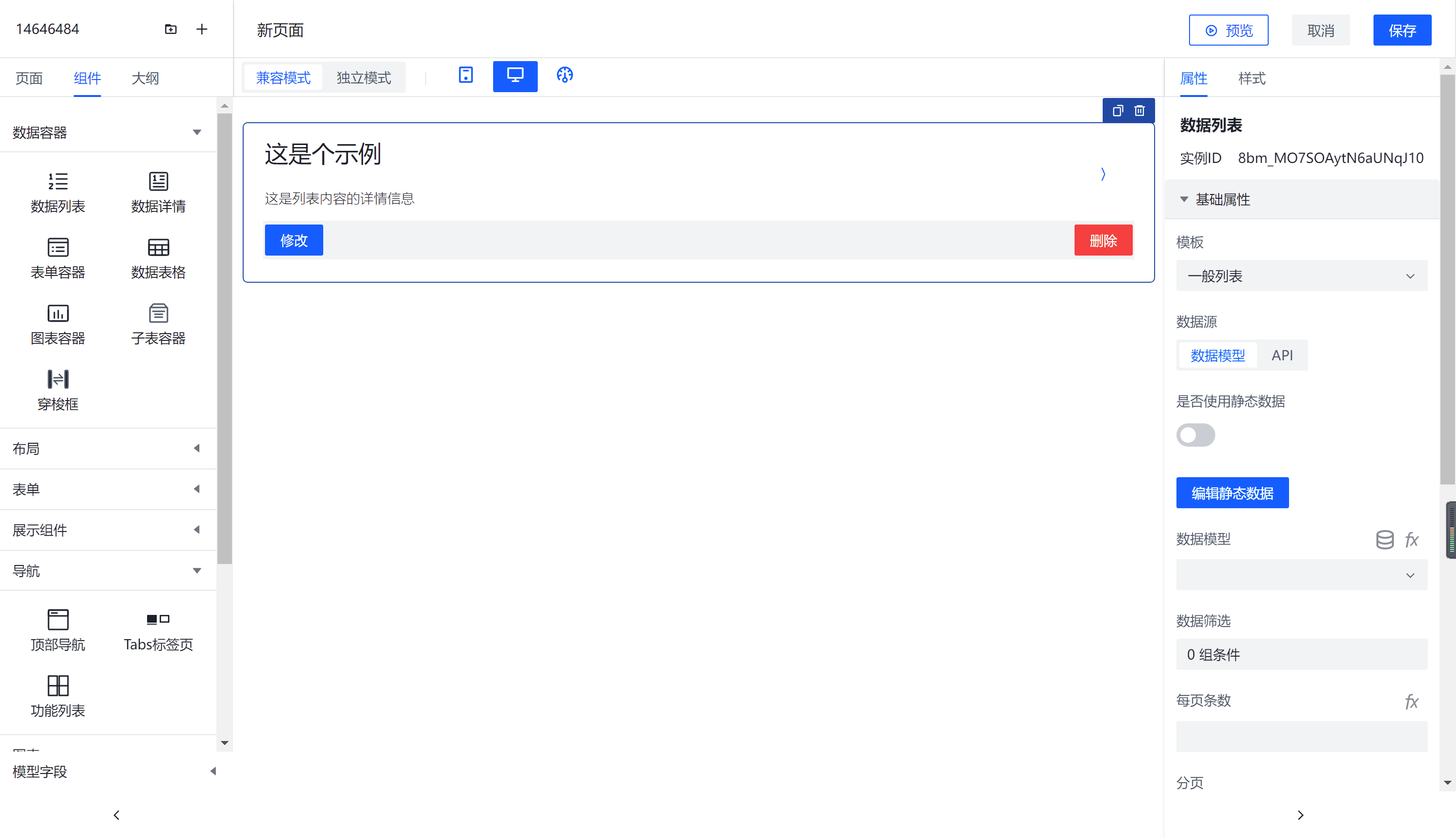 | 数据源 | 用户根据使用的数据源进行调整,可使用数据模型提供的数据源,也可以使用 API 提供的数据模型 |