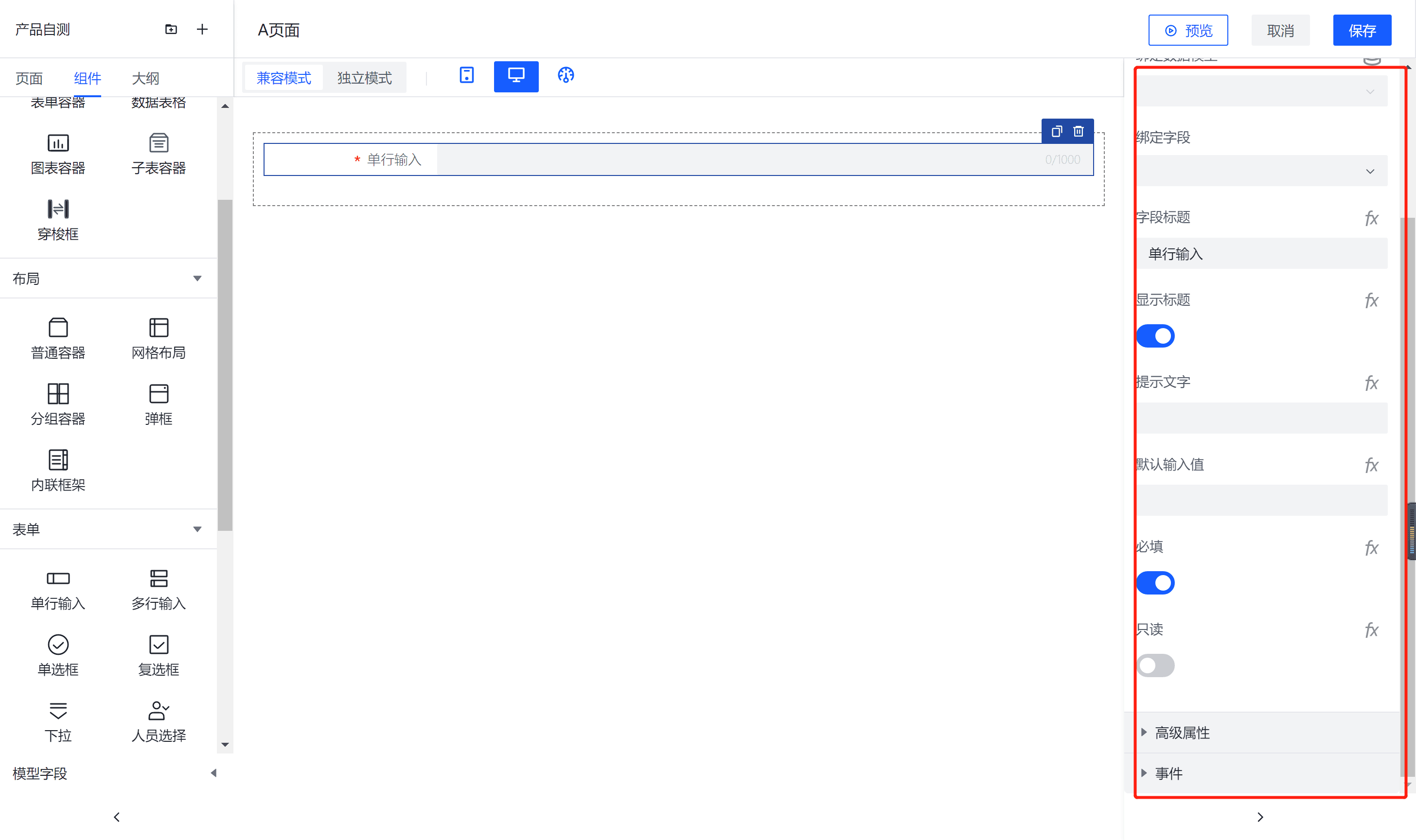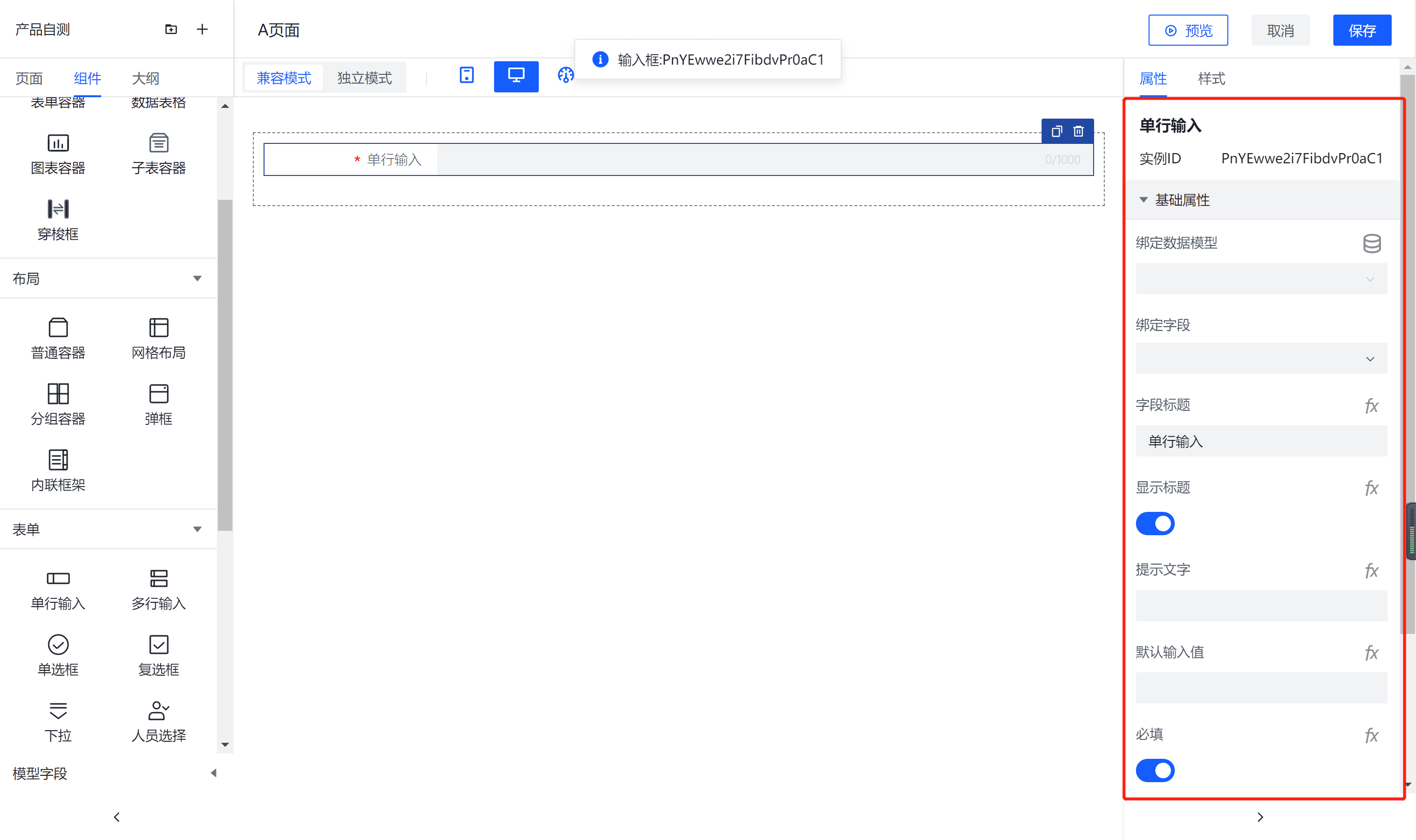 1、After binding a data model to a form container, you can use the single-line input component to input single-line data. It is configurable for input value, placeholder text, component size, and whether it should stretch horizontally (the component size and horizontal stretching are effective on PC but not on mobile).